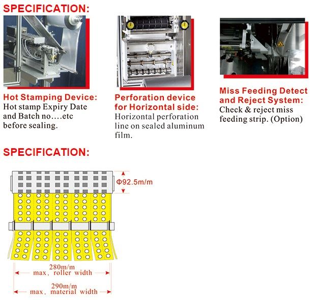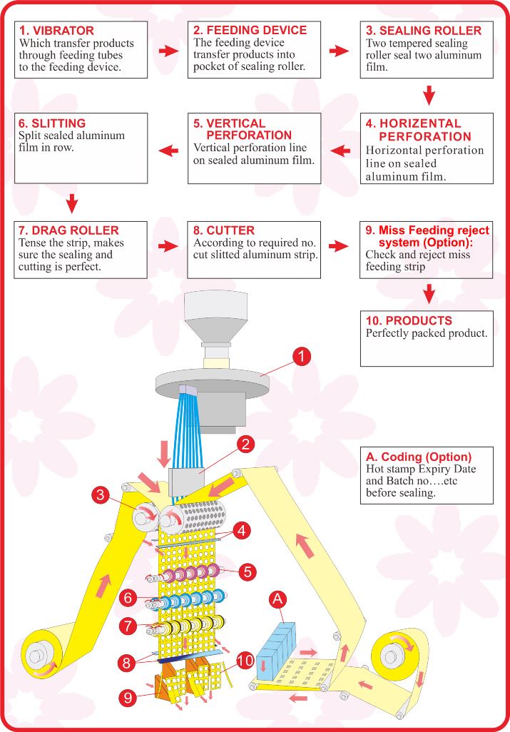 2. Used two roller sealing make around the pockets form a hermetic seal thus offering maximum shelf life to the product contained within strip pocket.